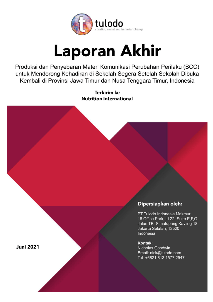 Tulodo was contracted by Nutrition International to lead the production of Behaviour Change Communication (BCC) materials to promote school attendance once schools reopened in East Java and East Nusa Tenggara provinces, Indonesia. The project aimed to encourage a safe and confident return to learning following COVID-19 disruptions. Tulodo collaborated with government stakeholders to ensure materials aligned with national education and health protocols, equipping schools with tools and guidance for reopening. The BCC materials targeted adolescents, parents, and teachers with clear, actionable messages on maintaining health and hygiene practices in schools.